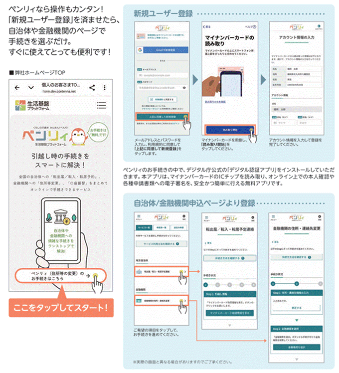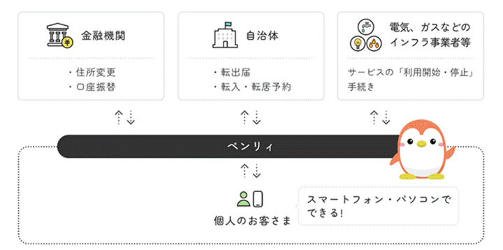| 「ペンリィ」とは、株式会社生活基盤プラットフォーム(以下、生活基盤プラットフォーム)※が提供する引越しなどの手続きワンストップサービスです。 |
